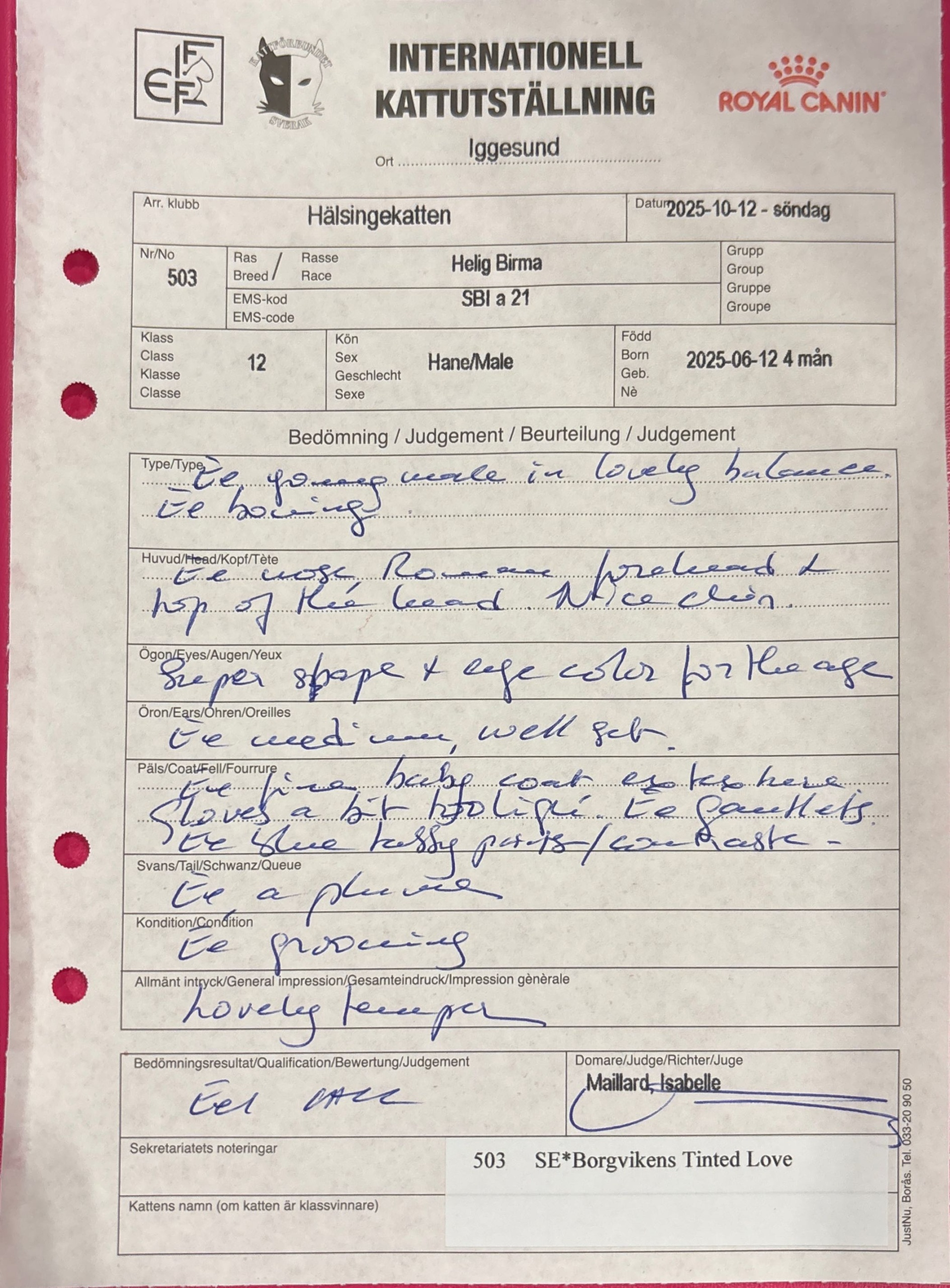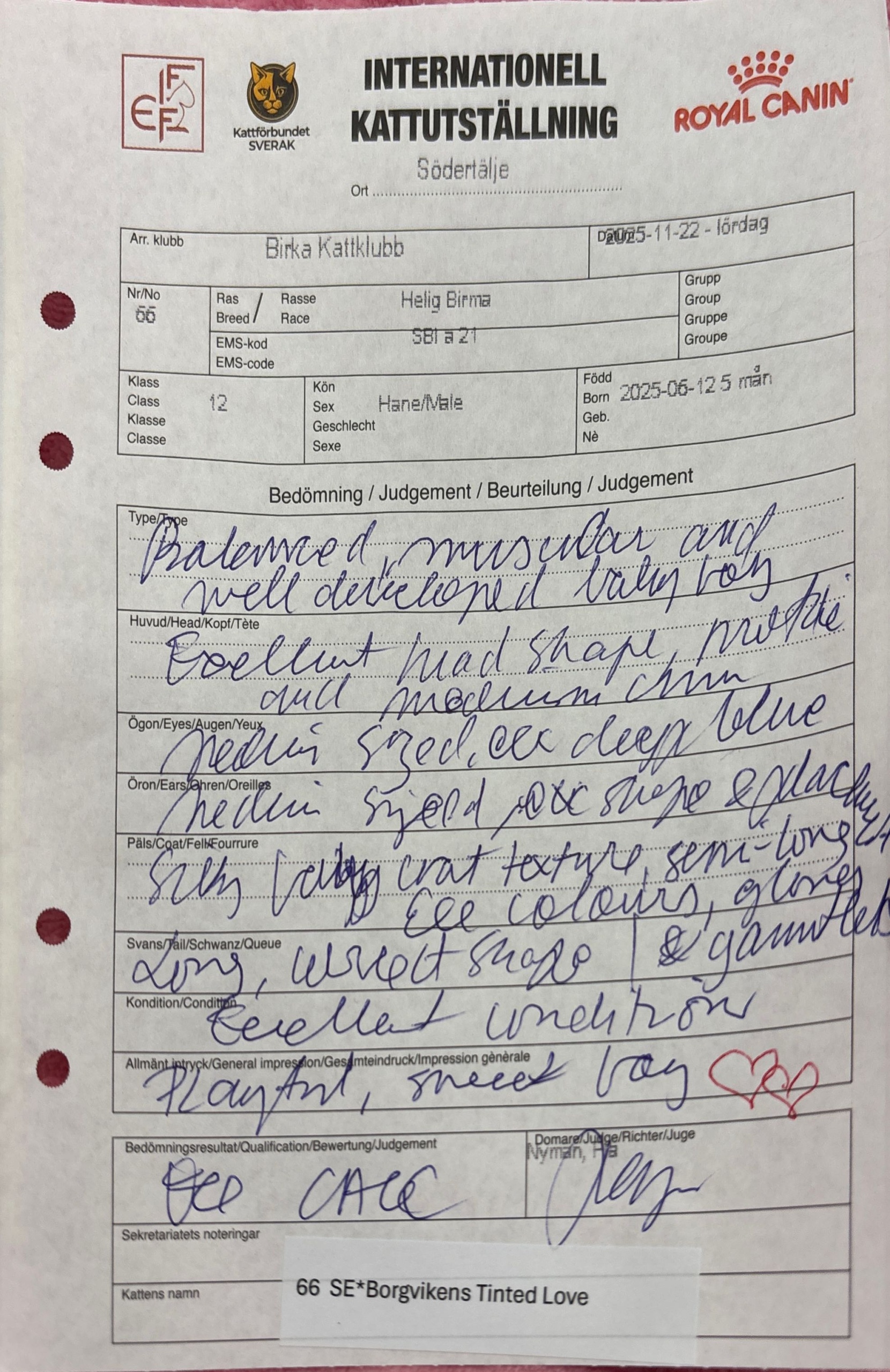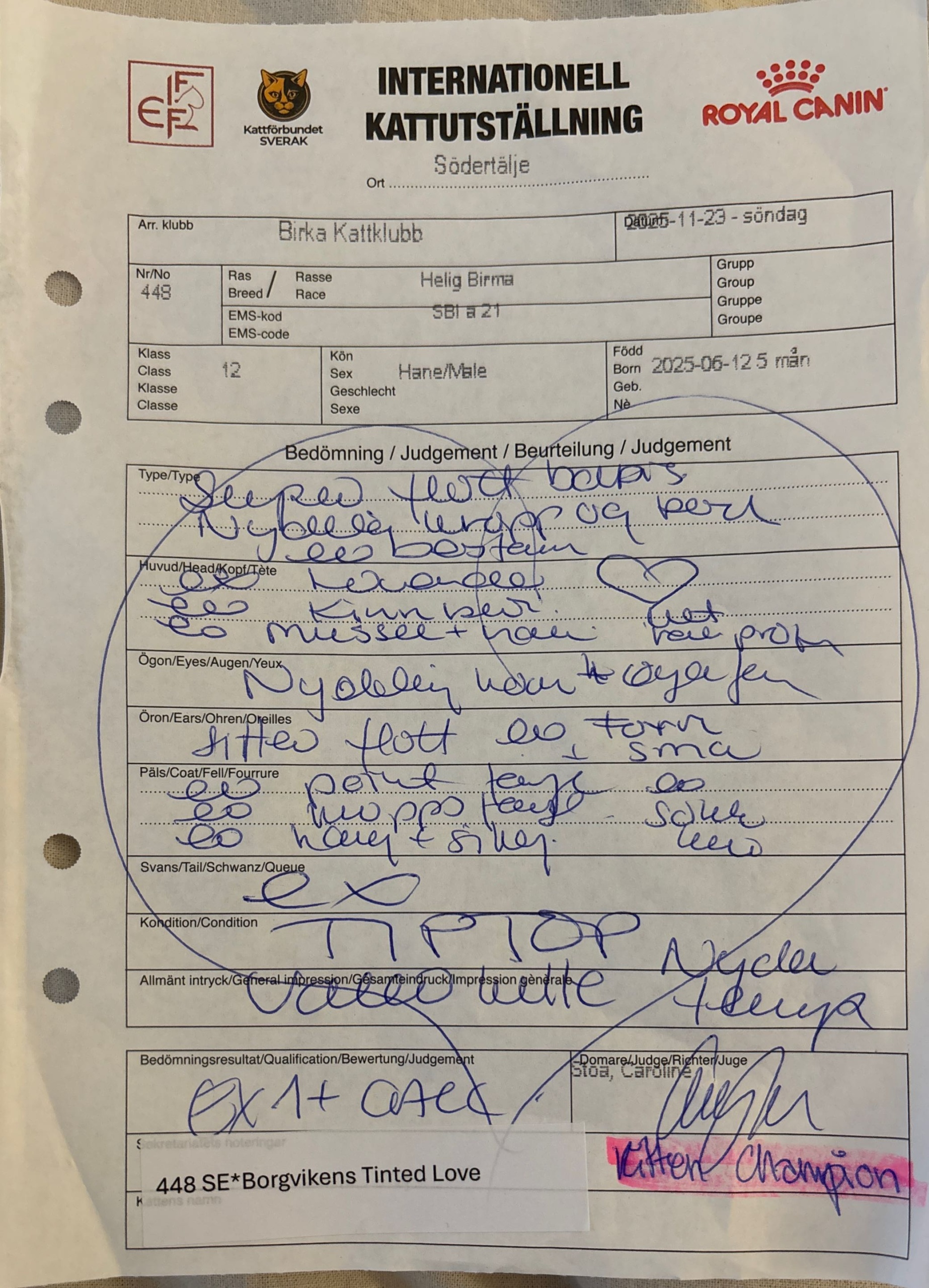 | 20251123 | BIRKA | Caroline Stoa | 12 | CACC, EX1 | Titel: Kitten Champion |